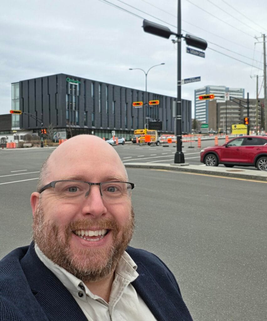 It would be impossible to drive through Lévis without mentioning Desjardins. This stop even offered a three‑for‑one view: Dan standing along Boulevard Alphonse‑Desjardins, across from the Caisse Desjardins de Lévis, with the Cité Desjardins de la coopération—the six‑building headquarters complex—visible in the background. Also nearby is the Maison Alphonse‑Desjardins, previously featured in an earlier edition of Dan’s Co‑op Adventures. This historic site is one of the inaugural 31 Co‑operative Cultural Heritage sites selected worldwide and marks the birthplace of the financial institution that today serves more than 10 million members and clients.