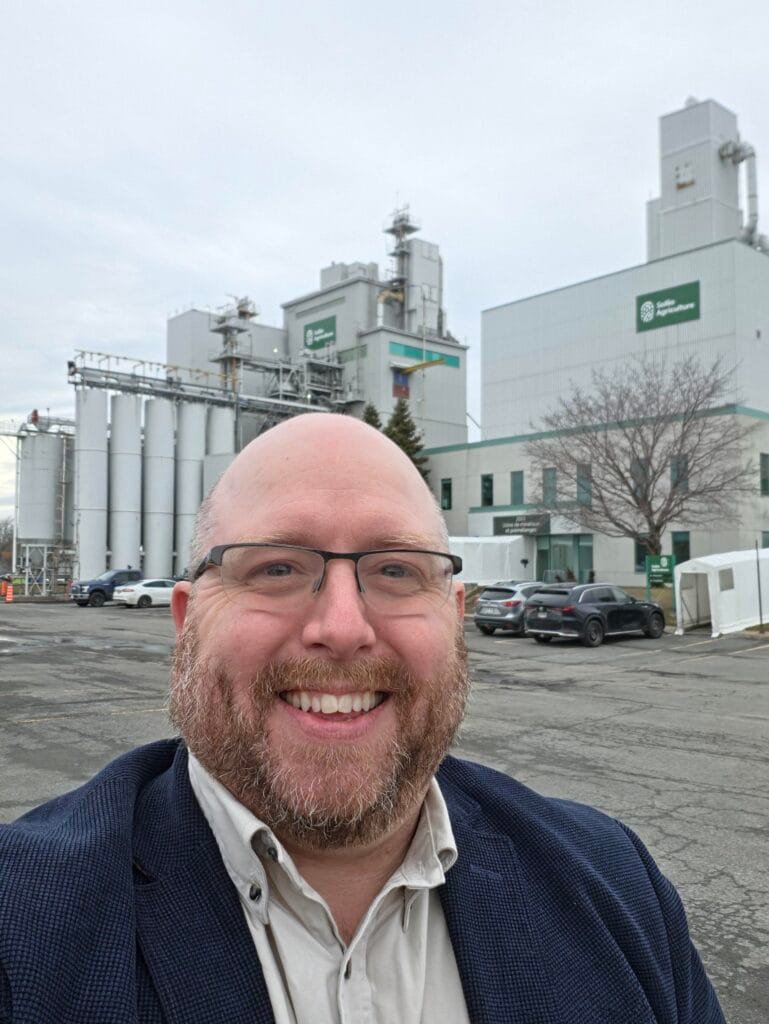 As he continued his drive through Lévis, a familiar logo caught Dan’s eye—prompting an inevitable quick stop outside a minerals and pre-mixes plant operated by Sollio Agriculture. Sollio Agriculture is one of three divisions that make up the Sollio Co‑operative Group, Canada’s largest agriculture and agri-food co‑operative. This division alone generates $2.5 billion in revenue, reflecting its significant role in supporting the country’s agricultural sector.