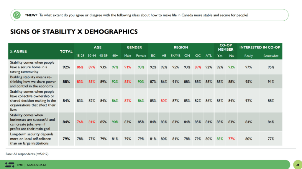 On March 25, CMC, CHF Canada, and Abacus Data brought these findings into a national conversation through the webinar Canadians Want Stability — Co‑operatives Deliver It.