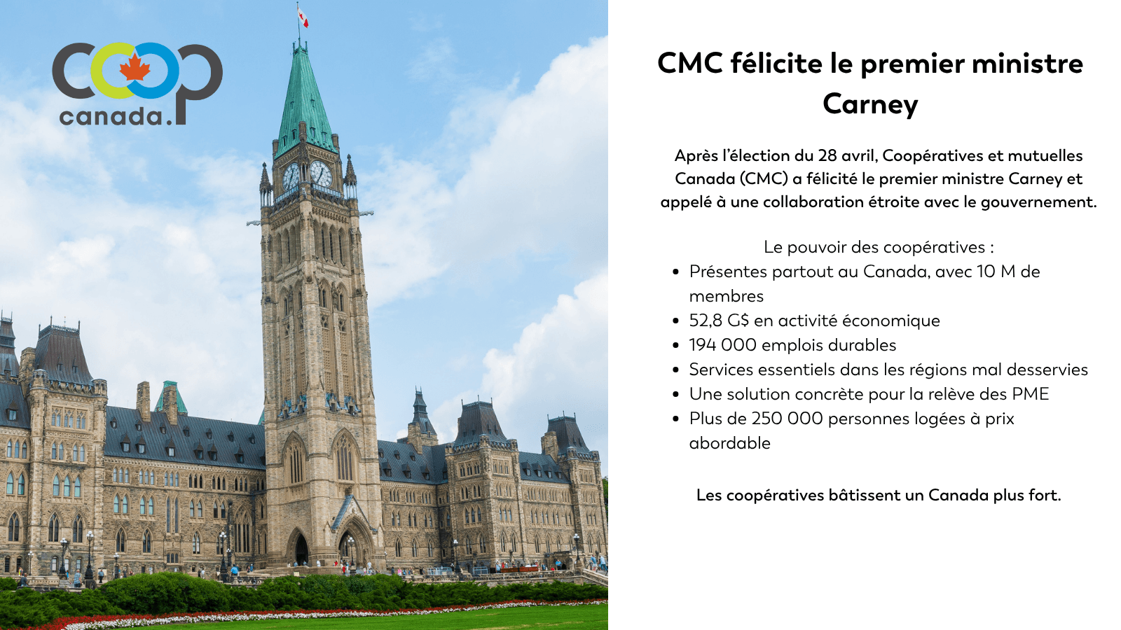 Au nom de Coopératives et mutuelles Canada (CMC), je tiens à vous féliciter pour la victoire du Parti libéral lors de l’élection fédérale du 28 avril 2025 et pour votre nomination à titre de premier ministre du Canada.